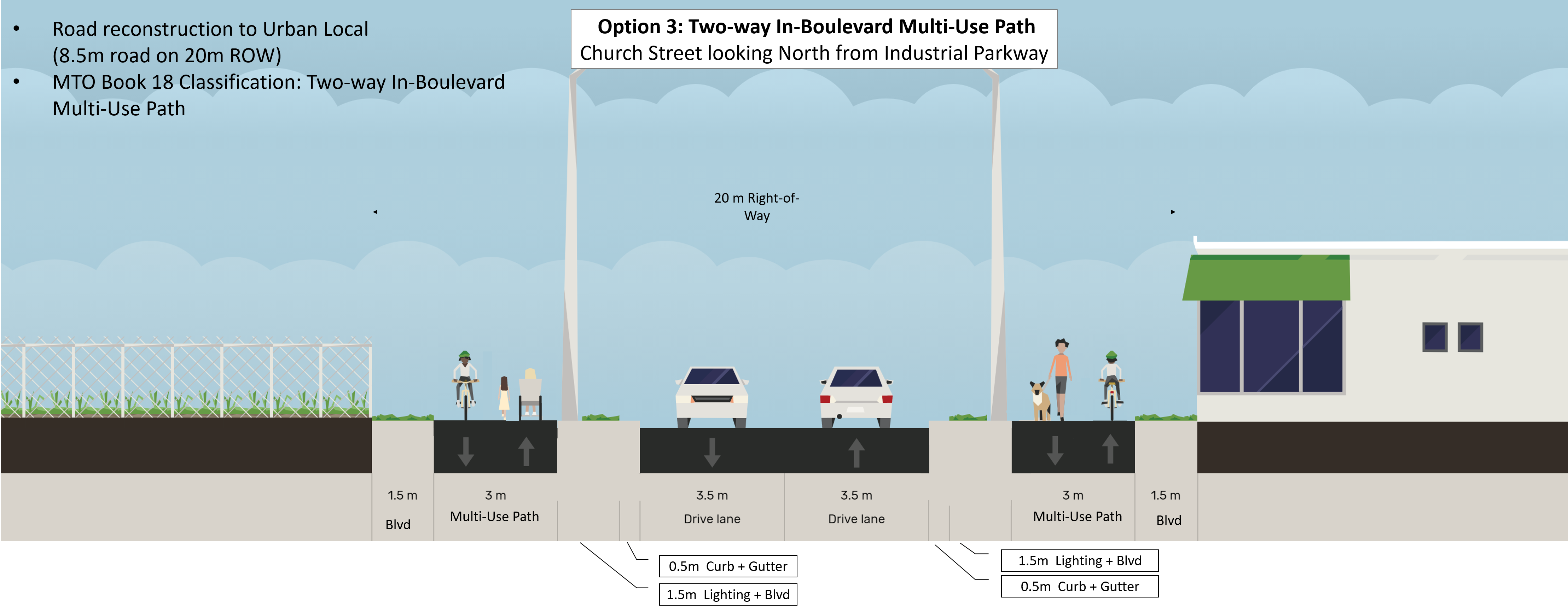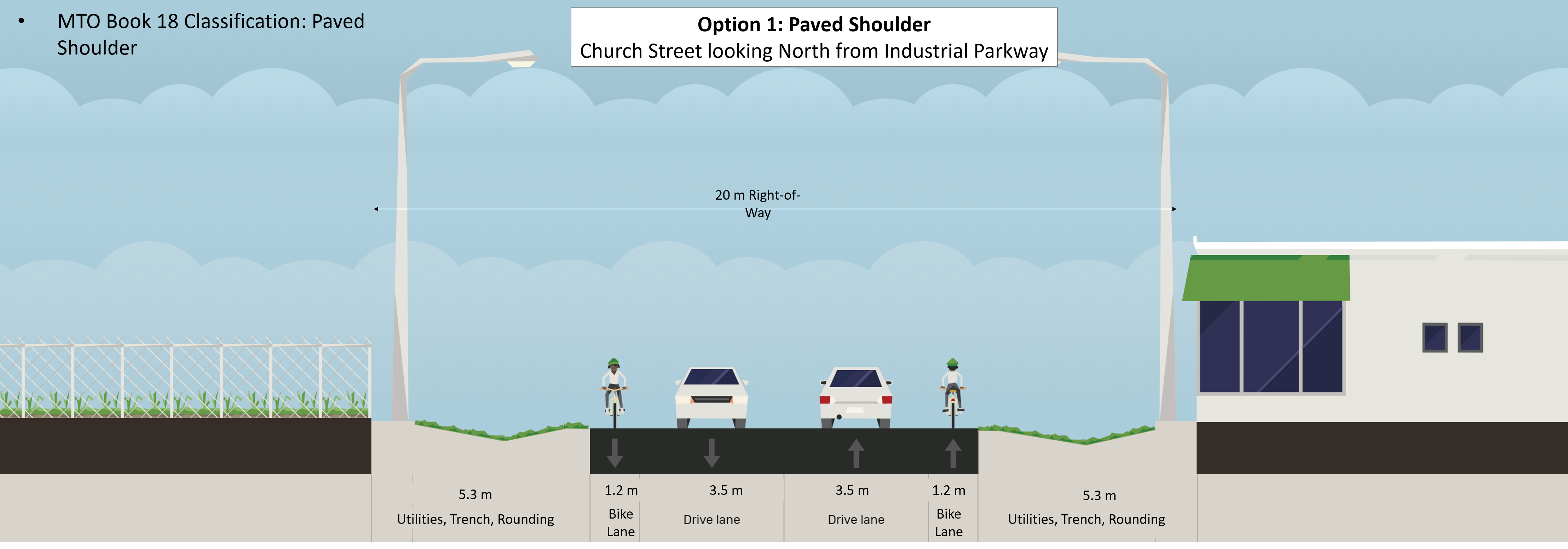 Part of this TMP Study includes exploring ways the Town can implement Complete Streets principles. Complete Street are streets that are designed to be safe for all users, including people who walk, cycle, take transit, or drive. The goal is to improve accessibility, safety, and comfort for road users of all ages and abilities while respecting the context of the street and surrounding land uses. The following cross sections illustrate several options on how Church Street (from Industrial Parkway to Beech Street), which is part of the Proposed Active Transportation Network, could be reconstructed to accommodate cyclists and/or pedestrians